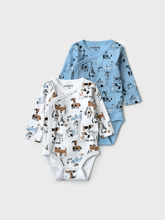 Комплект из двух боди для новорождённого мальчика. Один из боди выполнен на белом фоне с ярким принтом из мультяшных собачек и надписями, второй — голубого цвета с однотонным темно-синим принтом. У обоих изделий длинные рукава и запах на полочке с застежкой на кнопки, что делает их удобными для переодевания. Два ряда кнопок, боди растет вместе с малышом. Материал — мягкий интерлок, приятный к телу и подходящий для чувствительной кожи малышей.