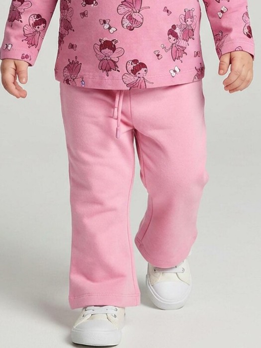 Детские брюки клеш для девочки. Выполнены из хлопкового трикотажа футер без начеса. Средняя посадка на талии. Пояс на резинке, дополнительно регулируется шнурком.