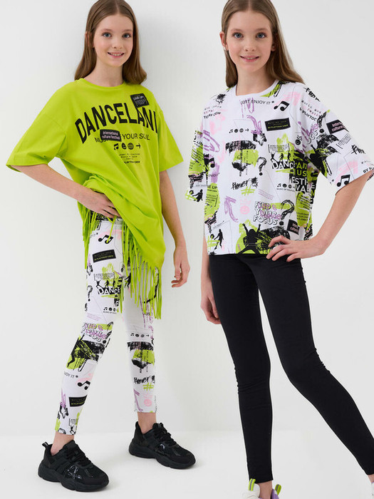 Набор легинсов для девочки подростка. Комплект состоит из двух пар длинных легинсов. Первая пара выполнена в классическом черном цвете, вторая — с ярким принтом в стиле музыкального фестиваля. Обе модели имеют высокую посадку и эластичный пояс, который хорошо фиксирует изделие на талии. Материал - мягкий, хлопковый трикотаж.