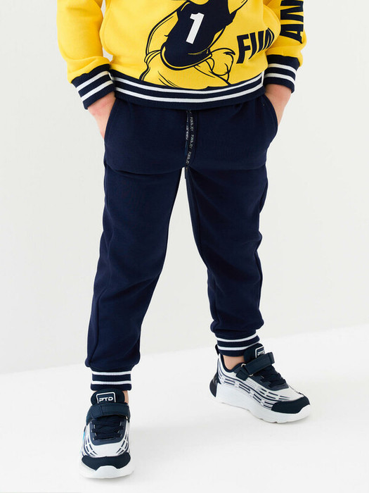 Трикотажные детские брюки джоггеры для мальчика. Модель выполнена из футера без начеса.  Пояс на широкой резинке дополнен декоративным шнурком с надписью "FIND & JOY". По бокам расположены удобные карманы. Низ брюк оформлен эластичными манжетами с контрастными полосками. Брюки подойдут для повседневной носки и активного отдыха.