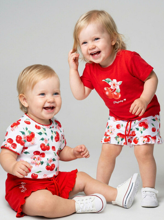 Набор детских футболок для девочки. Комплект из 2 футболок выполнен из хлопкового трикотажа интерлок. Застежка на плече на кнопках для удобного переодевания. Яркие красочные принты с вишнями, цветами и листьями.