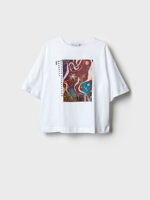 Футболка оверсайз для девочки подростка. Модель выполнена из мягкого хлопкового трикотажа джерси. На футболке изображена картина Василия Кандинского под названием «Движение», созданная в 1935 году. На спине — компактный принт с похожей тематикой. Горловина круглая, обработана эластичным рибом.