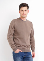 Мужской джемпер. Модель с длинными рукавами и классическим круглым вырезом. Выполнен из вязаного трикотажа и украшен стильным принтом в полоску. Горловина, манжеты и низ изделия обработаны эластичным рибом, что обеспечивает комфортную посадку. На левом рукаве - небольшая фирменная нашивка.