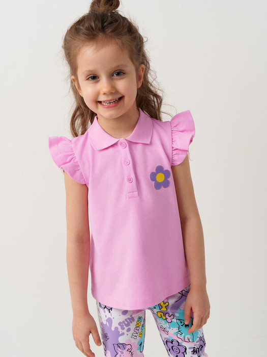 Детская футболка-поло для девочки. Модель из хлопкового трикотажа пике с короткими рукавами-крылышками. Поло прямого кроя, средней длины. Воротник и планка выполнены из рельефной трикотажной ткани. На груди — яркая вышивка в виде цветка. Застежка на три пуговицы.