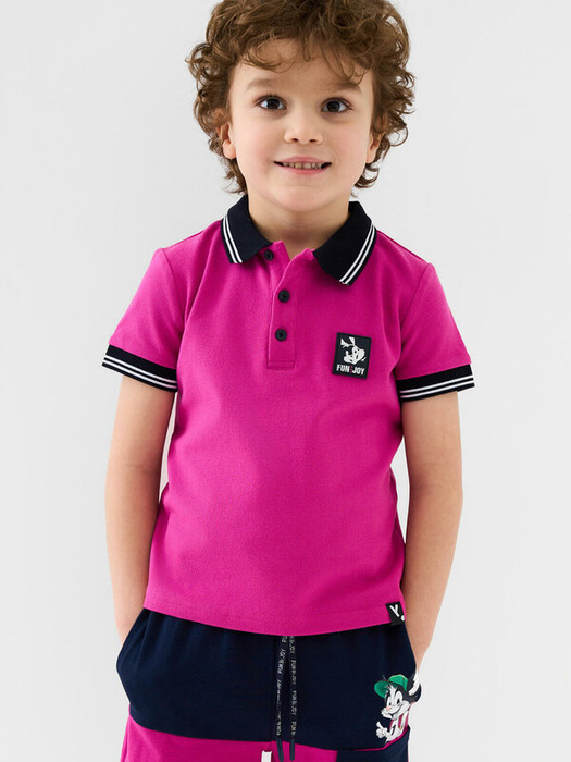 Детская футболка-поло для мальчика. Модель с коротким рукавом, выполненная из эластичного трикотажа пике. Изделие прямого кроя, средней длины. Отложной воротник, застёжка на груди с тремя пуговицами. На груди — декоративная резиновая нашивка. Манжеты и воротник выполнены из мягкого риба.