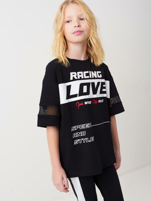 Футболка оверсайз для девочки подростка. Модель выполнена из эластичного хлопкового трикотажа джерси. На груди расположен крупный принт в гоночной тематике. Горловина круглая. Рукава со ставками из сетки.