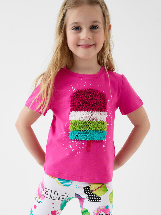 Детская футболка для девочки. Модель прямого кроя, выполнена из эластичного хлопкового трикотажа джерси. Спереди расположен крупный декор с мороженным, выполненным из сетки. Горловина круглая.
