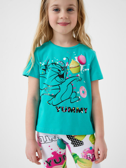 Детская футболка для девочки. Модель прямого кроя, выполнена из эластичного хлопкового трикотажа джерси. Спереди расположен крупный принт с любимым персонажем "Том и Джерри".