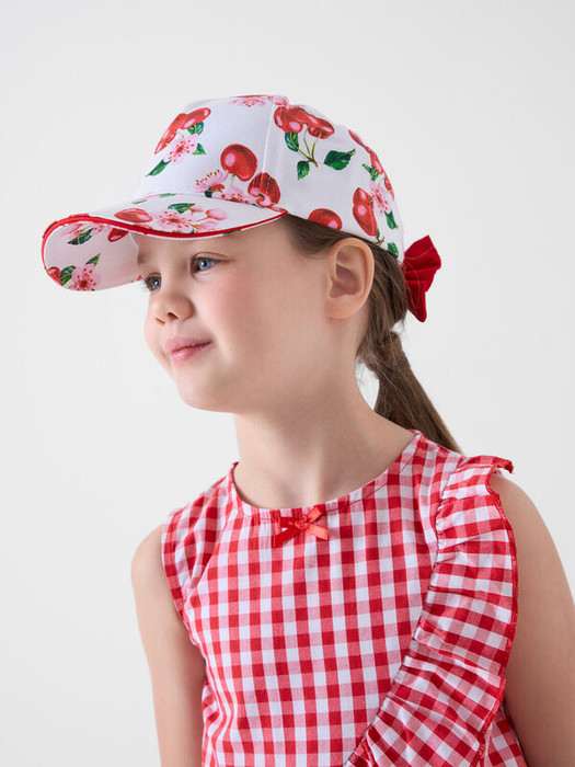 Лёгкая и яркая детская бейсболка для девочки. Выполнена из хлопкового текстиля с красочным принтом: вишни, листья и цветы. Козырёк изогнутый. Сзади — мягкая эластичная резинка, скрытая эффектной красной лентой с бантом. Есть вышитые вентиляционные отверстия.