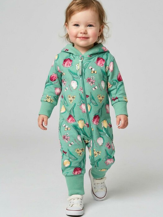 Комбинезон для новорождённой девочки. Модель с ножками и капюшоном, выполнен из мягкого футера из 100% хлопка. Цветочный принт с тюльпанами, бабочками. Комбинезон застёгивается на косую молнию спереди, что удобно при переодевании малыша. Манжеты на рукавах и брючинах выполнены из мягкого эластичного риба, обеспечивая комфортную посадку. Внутри капюшона — подкладка из джерси.