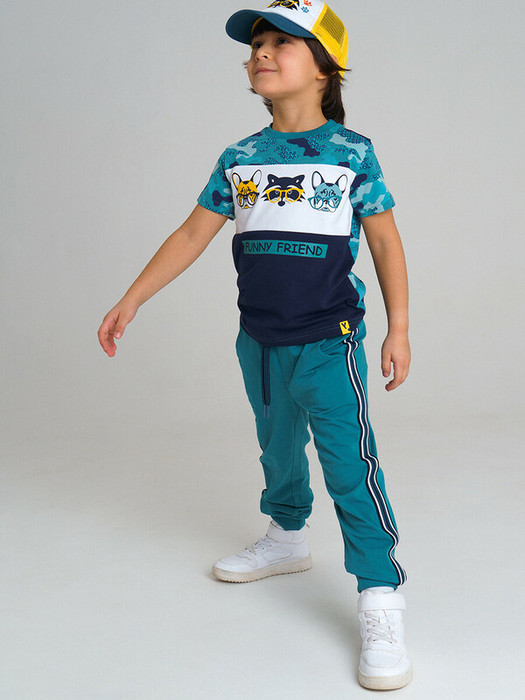 Комплект: футболка, брюки. Размер изделия на фото - 110, параметры модели (см): рост 110, обхват груди-талии-бедер: 58-54-60. Из качественного эластичного и приятного на ощупь трикотажа джерси. Высокое содержание хлопка 95%. Благодаря наличию эластана в составе ткани изделие держит форму и меньше мнется. Принт сохраняет первоначальный вид даже после многочисленных стирок. Эластичный пояс с тесьмой позволяет легко надевать и утягивать до идеальной посадки в зависимости от комплекции ребенка. Нижняя кромка брючин в эластичный рубчик.