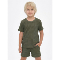 Легкий детский хлопковый костюм для мальчика. Рубашка прямого кроя с коротким рукавом и застежкой на кнопки. Классический воротник, накладные карманы. Свободные шорты на резинке со шнурком для регулировки. Удобные боковые карманы и карманы-карго.
