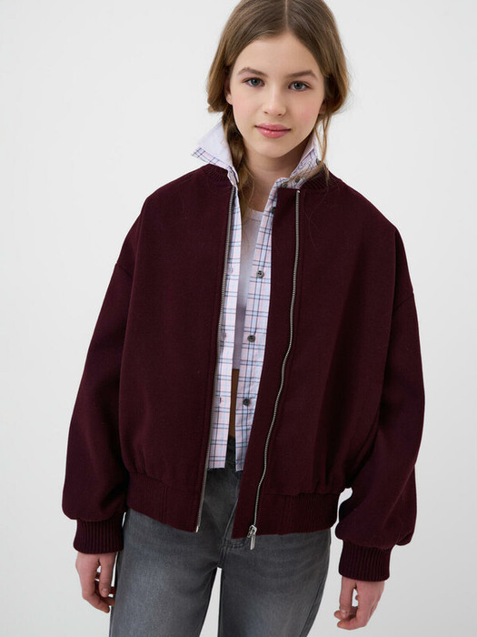 Бомбер оверсайз для девочки подростка. Температурный режим от +10 до +20С. Выполнен из плотной ворсистой ткани винного оттенка. Внутри гладкая подкладка. На воротнике, манжетах и по низу изделия — широкая трикотажная резинка. Два боковых кармана. Внутренний карман на липучке. Изделие предназначено для весенне-осеннего сезона.