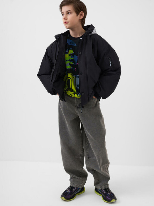 Лёгкая оверсайз куртка, выполненная в спортивном стиле для мальчика подростка. Температурный режим от +15°C до 0°C. Гладкая подкладка. Свободный крой и длину до бёдер. Застёжка на кнопках. Капюшон со шнуром для регулировки. На груди — чёрная резиновая нашивка. На рукаве и по бокам расположены карманы на молнии. Внутренний карман на липучке. На спинке — светоотражающая нашивка для безопасности в ночное время суток. Манжеты и нижний край выполнены из риба, что обеспечивает комфортную посадку.