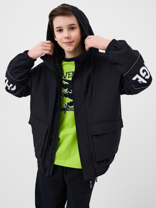 Ветровка на трикотажной подкладке для мальчика подростка. Температурный режим от +20°C до +10°C. Ветрозащитное и водоотталкивающее покрытие. Модель выполнена в черном цвете с контрастными белыми деталями. На рукавах — вставки со светоотражающей полосой. Два объемных кармана на липучках с дополнительным боковым входом. Капюшон регулируется шнуром. По низу изделия и на рукавах — мягкие резинки. Внутренний карман на липучке и петелька для вешалки. Светоотражающие элементы добавляют безопасность в тёмное время суток.