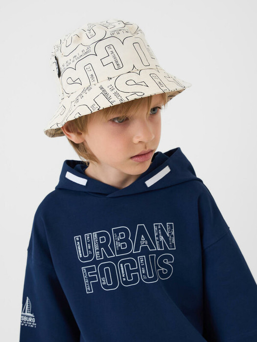 Текстильная хлопковая панама для мальчика подростка. Изделие имеет классическую форму с расширяющимися полями и выполнено из ткани с оригинальным графическим принтом. На светло-бежевом фоне размещены надписи и координаты, отсылающие к Санкт-Петербургу. Для вентиляции предусмотрены металлические люверсы по бокам. Сзади — декоративная чёрная лента с логотипом. Панама имеет внутреннюю подкладку.
