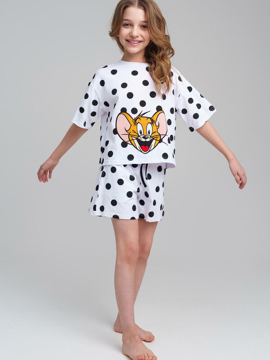 Пижама для девочки подростка. Футболка и шорты из эластичного и приятного на ощупь трикотажа. Шорты на резинке со шнурком. Высокое содержание хлопка 95%. Благодаря наличию эластана в составе ткани изделие держит форму и меньше мнется.