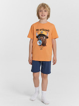 Пижама для мальчика подростка. Футболка оверсайз с короткими рукавами и круглым воротом оформлена крупным принтом на спинке с изображением скейтбордиста, а спереди — креативным принтом. Шорты имеют камуфляжный узор в чёрно-серой гамме и дополнены ярко-оранжевым декоративным шнурком в поясе. На шортах предусмотрены боковые карманы. Изделие выполнено из мягкого хлопкового трикотажа.