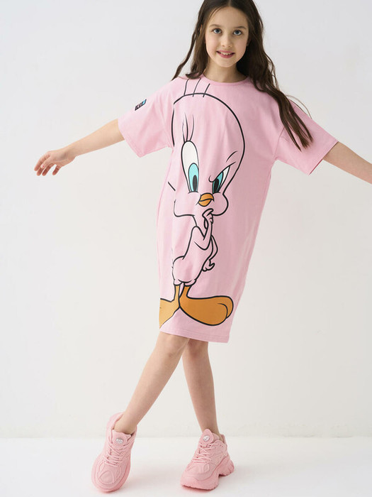 Платье-футболка для девочки подростка. Модель чуть выше колена, выполнена из хлопкового трикотажа джерси. Украшена яркими принтами и нашивками с любимым мультяшным персонажем Твити.