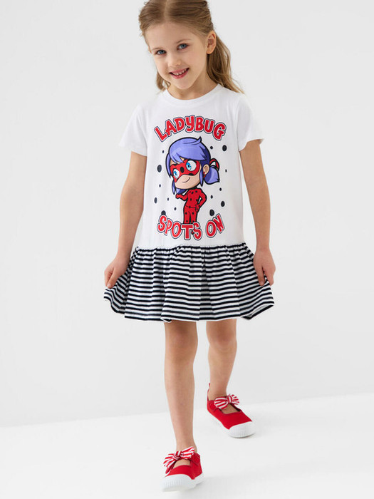 Стильное детское платье для девочки. Верх выполнен в виде футболки прямого кроя с короткими рукавами, а по низу декоративная сборка. Спереди — яркий принт с любимым мультяшным персонажем Леди Баг. Горловина круглая, с аккуратной отделкой. Платье выполнено из мягкого хлопкового трикотажа джерси.