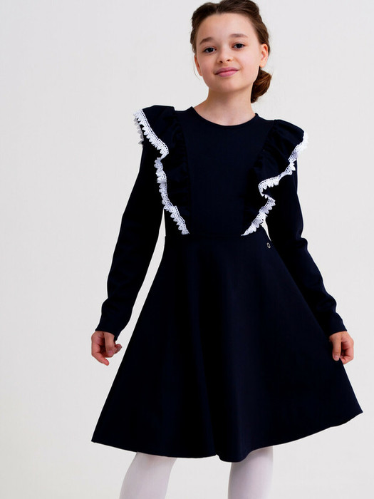 Школьное платье для девочки подростка. Синее платье свободного силуэта из трикотажа идеально в школу. Платье для школы выполнено из ткани с высоким содержанием вискозы, что обеспечивает максимальный комфорт для школьницы во время занятий. Вискоза отличается высокой гигроскопичностью - она впитывает влагу и отлично сохраняет тепло. Спереди платье имеет имитацию застежки и карманов. Платье декорировано воланами. Платье имеет застежку на молнию.