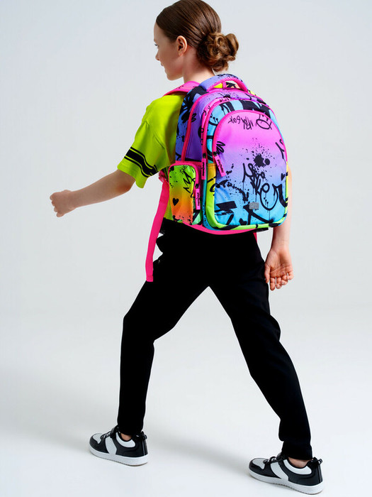 Школьный рюкзак для девочки подростка. Прямые широкие регулируемые лямки с мягкими вкладками и сетчатым покрытием для улучшения вентиляции, 3 основных отделения на молнии, 2 боковых  кармана: сетчатый и на молнии. Внутри: 1 отсек: карман на молнии, открытые карманы для канцелярии. 2 отсек: без карманов, 3 отсек: карман для папок, карман на молнии, 2 кармана без замка, карабин для крепления пропуска/пенала/ключей, усиленная спинка, дно и верхняя ручка, спинка и обратная часть плечевых ремней - сетчатые, для улучшенной вентиляции, светоотражающие элементы на переднем кармане и плечевых ремнях. Рюкзак в школу можно дополнить мешком для обуви и пеналом в том же дизайне.