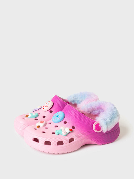 Оригинальное сабо для девочки. Сабо из облегченного и прочного ЭВА. Модель декорирована объемными джибицами в стиле сandy.. Материал хорошо моется. Форма модели учитывает эргономику стопы. Модель имеет перекидной ремешок для лучшей фиксации обуви на ноге. Ремешок имеет  модную меховую отделку, которую при желании можно снять, так как ремешок отстегивается