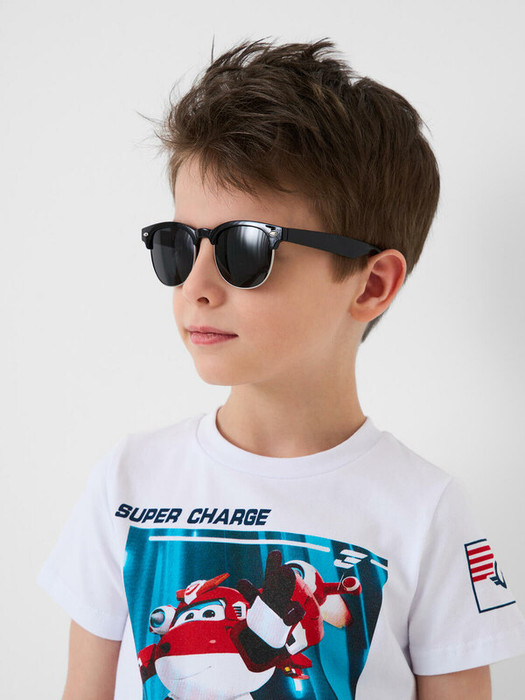 Солнцезащитные очки классической формы для мальчика. Оправа в стиле OLD SCHOOL подходит для мальчиков с крупными чертами лица. Оправа выполнена из поликарбоната и и антиаллергенного медного сплава. Солнцезащитные очки с фильтром Cat3 и поляризацией. Тёмные линзы имеют защиту UV400, которая отражает 100% ультрафиолетовых лучей с длиной волны менее 400 нанометров, эффективно блокируя все ультрафиолетовые лучи при солнечном свете. Ширина оправы - 126 мм, длина дужек - 121 мм. Обхват головы 50-52 см. Небьющиеся линзы из триацетата целлюлозы устойчивы к царапинам. Поляризационные фильтры на очках поглощают блики, отражаемые от горизонтальных поверхностей, что помогает повысить четкость зрения и избежать напряжения глаз ребенка. Только при просмотре в линзах с поляризацией видны воздушные шарики в виде сердечек на тест-картинке, вложенной в чехол. Такие очки эффективны для защиты глаз в тропиках, у моря и в горах. В комплекте: текстильный чехол, тест-картинка со слониками. Текстильный чехол выполнен из микрофибры и им легко ухаживать за изделием. Очки транспортируются в картонной коробке.