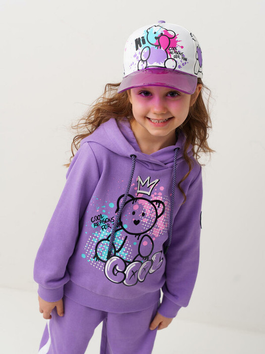 Детское худи для девочки. Выполнено из хлопкового футера без начеса. На передней части — красочный принт с мишкой. На плече - нашивка. Капюшон регулируется шнуром. Низ изделия и рукава оформлены эластичными резинками.