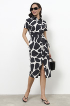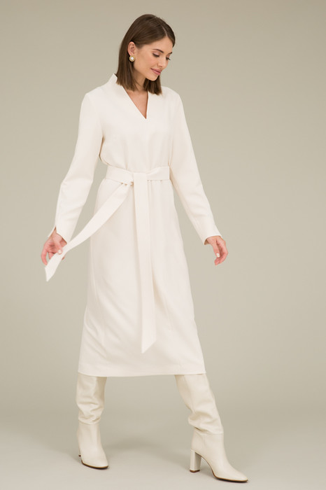 Платье свободного силуэта из плательной ткани. По центру передней части изделия выполнен шов. Цельнокроеная стойка, переходящая в V-образный вырез горловины, визуально делает фигуру стройнее. Втачной длинный рукав с центральным швом и декоративным разрезом по низу рукава. Пояс в комплекте.