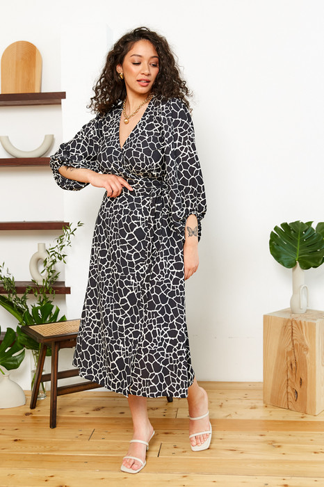 Платье отрезное по линии талии из плательной ткани. Изделие, прилегающее в области груди и свободное в области бедер. Глубокий V-образный вырез горловины плавно переходит в запах, фиксируется притачным поясом. Втачной рукав со сборкой по окату и низу рукава. Асимметричный низ рукава окантован бейкой.