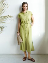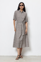 Платье приталенного силуэта из вискозной плательной ткани. Изделие отрезное по линии талии с защипами. В боковых швах карманы. Втачной короткий рукав. Притачная планка с застёжкой на пуговицы. Вырез горловины обработан отложным воротником на стойке. В комплекте пояс из основной ткани.