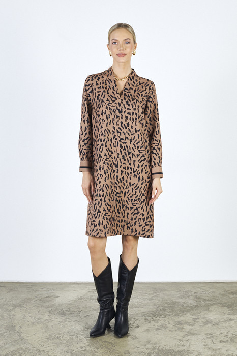 Платье свободного силуэта из плательной ткани. По центру передней части изделия выполнен шов. Цельнокроеная стойка, переходящая в V-образный вырез горловины, визуально делает фигуру стройнее. Втачной длинный рукав. Низ рукава на манжете с застёжкой на пуговицы-жемчужины.