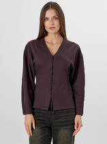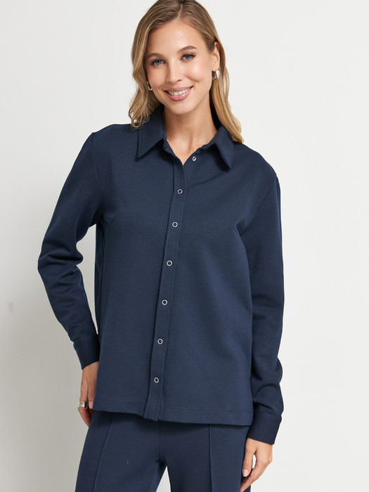Жакет выполнен из эластичного полотна. Изделие в рубашечном стиле. Свободный силуэт с разрезами в боковых швах и застёжкой на планке. Вырез горловины обработан отложным воротником на стойке. Втачной рукав на манжете с застёжкой на кнопки.