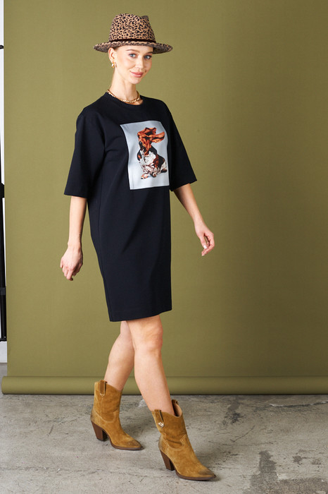 Платье свободного силуэта из футера. Короткий втачной рукав в спущенную пройму. Вырез горловины оформлен бейкой. На передней части изделия выполнена аппликация.