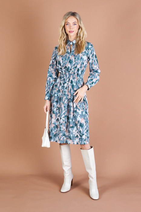 Платье свободного силуэта из струящейся плательной ткани. Изделие по линии талии на резинке, на юбке-сборка. V-образный вырез горловины обработан отложным воротником на стойке. Втачной длинный рукав с манжетой, застегивающейся на пуговицы.