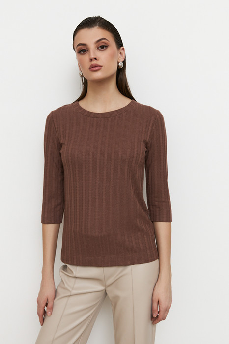 Джемпер прилегающего силуэта из фактурного эластичного полотна. Втачной рукав 3/4. Круглый вырез горловины оформлен бейкой.