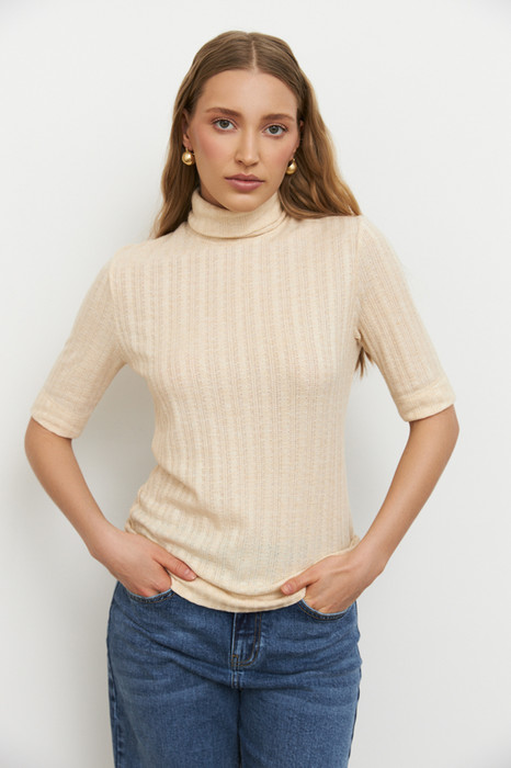 Джемпер прилегающего силуэта из фактурного эластичного полотна. Втачной короткий рукав. Вырез горловины высокая стойка. Джемпер – это хорошая базовая вещь, подходящая для любого гардероба.