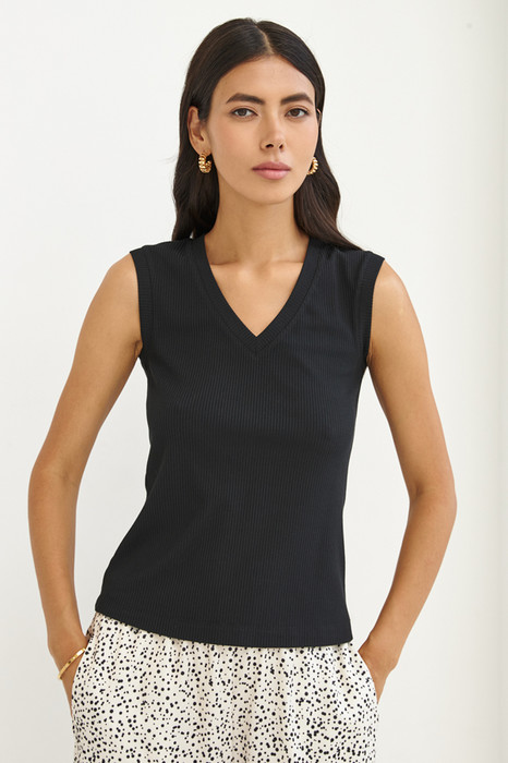 Джемпер прилегающего силуэта из эластичного полотна в рубчик. V-образный вырез горловины и линия проймы оформлены бейками.