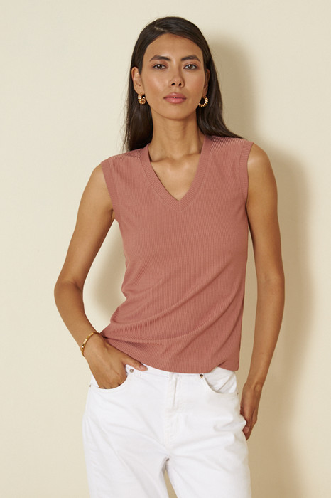 Джемпер прилегающего силуэта из эластичного полотна в рубчик. V-образный вырез горловины и линия проймы оформлены бейками.