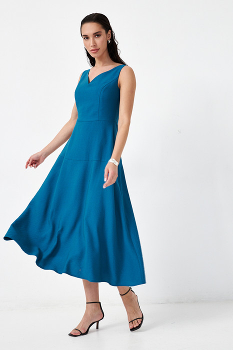 Платье на бретелях, отрезное по линии талии из вискозной ткани с крэш-эффектом. Изделие, прилегающее в области груди и свободное в области бедер. Нижняя часть платья по силуэту колокол с кокеткой. Лиф двухслойный с красивым женственным вырезом и рельефными швами от проймы. По среднему шву спинки застежка-молния.