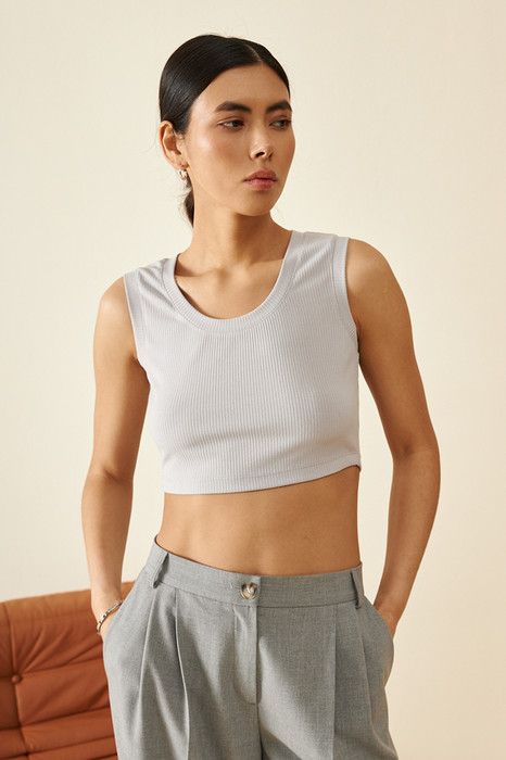 Укороченный топ на лямках из эластичного полотна в рубчик. Прилегающий силуэт. Круглый вырез горловины и линия проймы оформлены бейками.