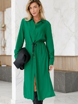 Платье свободного силуэта из фактурного эластичного полотна. V-образный вырез горловины обработан притачной планкой. Втачной длинный рукав в спущенную пройму с манжетой. Манжет рукава и планка выполнены из ткани-компаньона.
