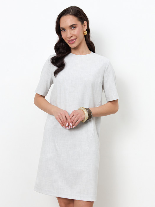Платье свободного силуэта из плательной ткани. На передней части изделия выполнены декоративные рельефы и карманы. Втачной короткий рукав. Круглый вырез горловины, по среднему шву спинки застёжка на молнию.