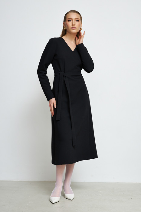 Платье отрезное по линии талии из фактурной плательной ткани. Изделие, прилегающее в верхней части и расширенное книзу. Глубокий V-образный вырез горловины плавно переходит в запах, фиксируется притачным поясом. Втачной длинный рукав.