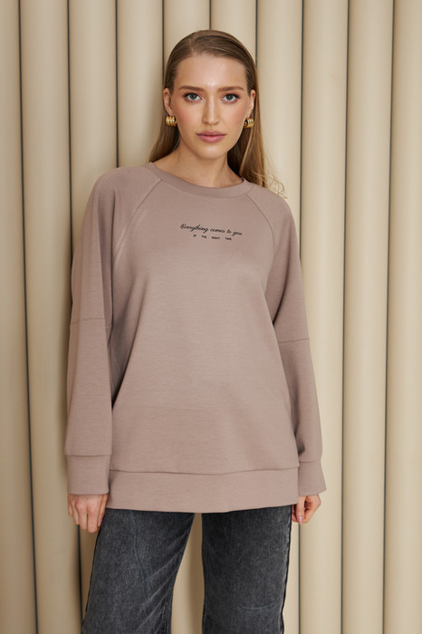 Свитшот свободного силуэта из эластичного полотна. Круглый вырез горловины оформлен бейкой. Рукав реглан с горизонтальным швом в области локтевого сгиба. По низу изделия и рукавов выполнены притачной пояс и манжеты из основной ткани. В таблице размеров представлены параметры человека, а не изделия.