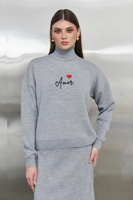 Джемпер свободного силуэта с вышивкой в области груди. Рукав втачной в спущенную пройму. Низ изделия и низ рукава оформлены резинкой, воротник-стойка с отворотом. Изделие выполнено из меланжевой пряжи.