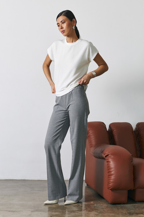 Брюки прямого силуэта из костюмной ткани. Пояс притачной с эластичной резиной. На передней части брюк застрочены стрелки.