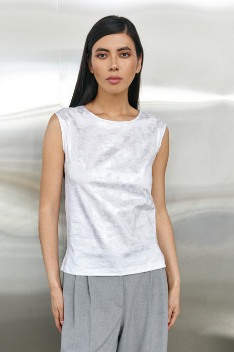 Топ из хлопковой ткани с серебристым накатом. Свободный силуэт, с небольшими разрезами в боковых швах. Круглый вырез горловины и линии проймы окантованы косыми бейками из основной ткани.
