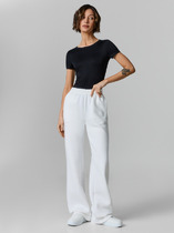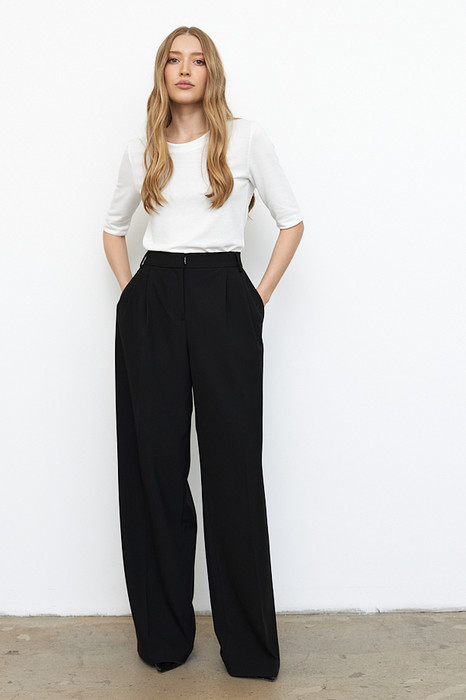 Брюки свободного силуэта из меланжевой костюмной ткани. На передней половинке выполнены карманы с подкройным бочком, по линии талии заложены складки. На задней половинке - талиевые вытачки и имитация карманов в рамку. Притачной пояс со шлёвками. Застёжка на молнию-гульфик и крючок. Такой крой выгодно подчеркнёт длину ваших ног.